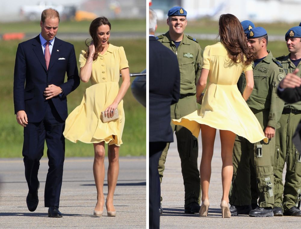 Angela Kelly spolupracuje s královnou už nějaký ten pátek, a je tak zvyklá a navrhovat šaty, které jsou jednak krásné, ale i prakticky nositelné. A mělo by se tak předejít tomu, aby se Kate stalo třeba něco podobného, jako to co minule, že ji na letišti, kde byl docela větřík zlobily nádherné kanárkově žluté šaty. Chvílemi se stávalo, že šaty větr nadfoukl až nebezpečně vysoko.